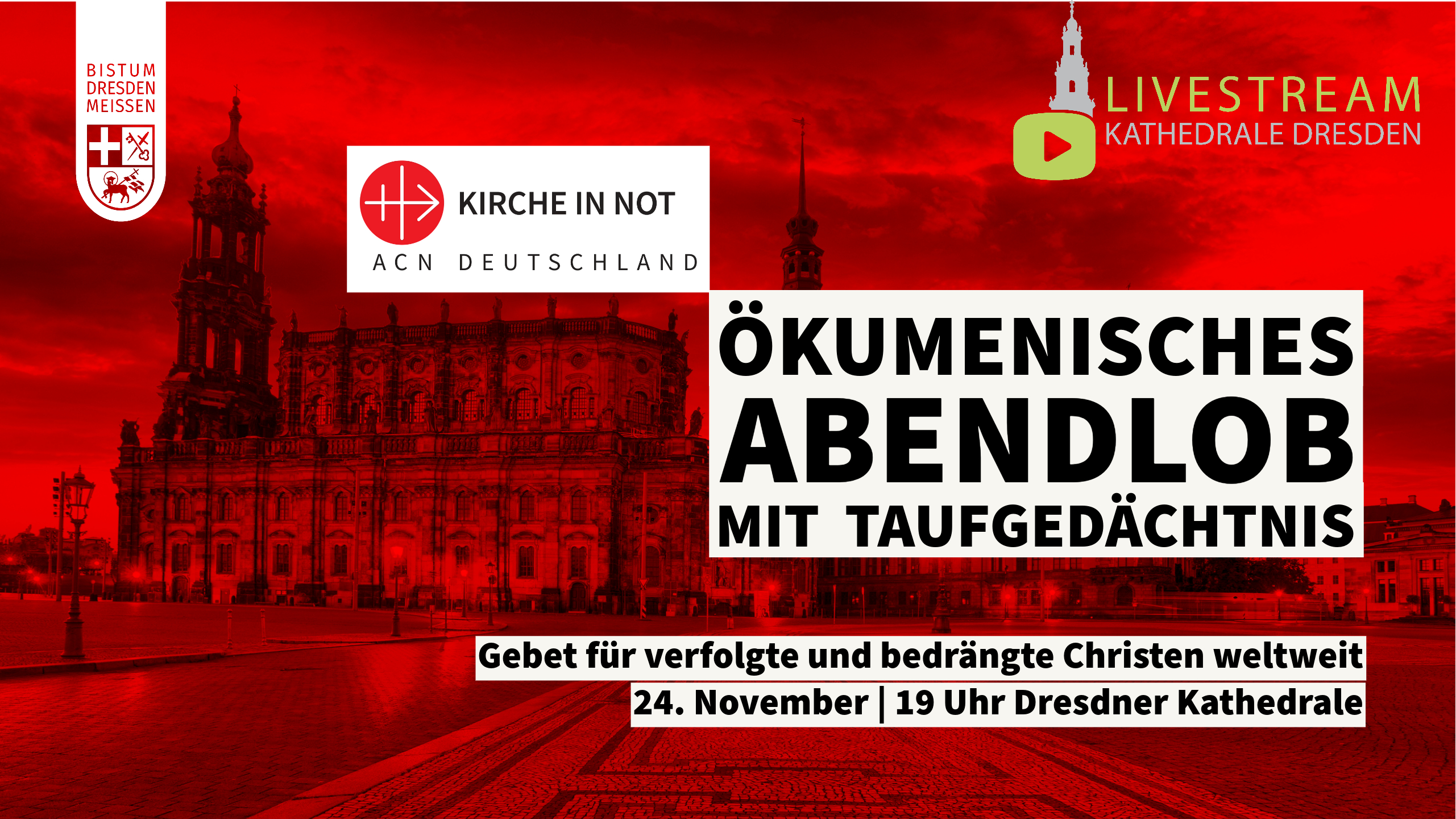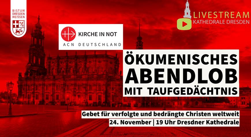 Rund um den 22. November ruft das Hilfswerk "Kirche in Not" zum Gebet auf: In Dresden wird aus diesem Anlass am 24. November die Kathedrale rot angeleuchtet, und mit einem Ökumenischen Abendlob 19 Uhr der verfolgten Christen gedacht. Herzliche Einladung auch im Anschluss zum Impulsvortrag mit dem armenisch-orthodoxen Bischof Ashkarian aus Aleppo im Anschluss Weitere Infos im Anhang oder https://www.selige-maertyrer-dresden.de/aktuelles/item/1535-oekumenisches-ab... Livestream zum Abendgebet: https://www.youtube.com/watch?v=S9q_Ij4NFWs [cid:image003.jpg@01DA1C87.757956E0] Elisabeth Schwope -------------------------------------------------------------------------------------- Gemeindereferentin Pfarrei Selige Märtyrer vom Münchner Platz Telefon: +49 (0) 1578 3459869 E-Mail: Elisabeth.Schwope@pfarrei-bddmei.de<mailto:Elisabeth.Schwope@pfarrei-bddmei.de> Dienstsitz: St. Antonius Löbtau Schillingplatz 17 01159 Dresden [SeligeMärtyrer_LogomitSchriftzug]