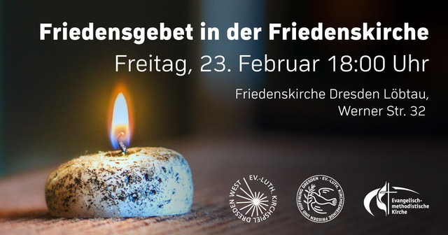 Liebe Gemeindemitglieder, Die evangelische Kirchgemeinde Frieden und Hoffnung lädt am Freitag, 23. Februar um 18 Uhr zum ökumenischen Friedensgebet ein. Es findet in der Friedenskirche auf der Werner Str. 32 in Dresden-Löbtau statt. Herzliche Grüße die Organisatoren des Friedensgebets